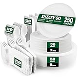 2XH.Easy GoXH.Easy Go 250 PCS Disposable Paper Plates with Cutlery Set 100% Compostable and Heavy Duty Paper Plates Set Include 7&9 Inch Plate, Forks, Knives and Spoons Dinnerware Set for 50 Guests
